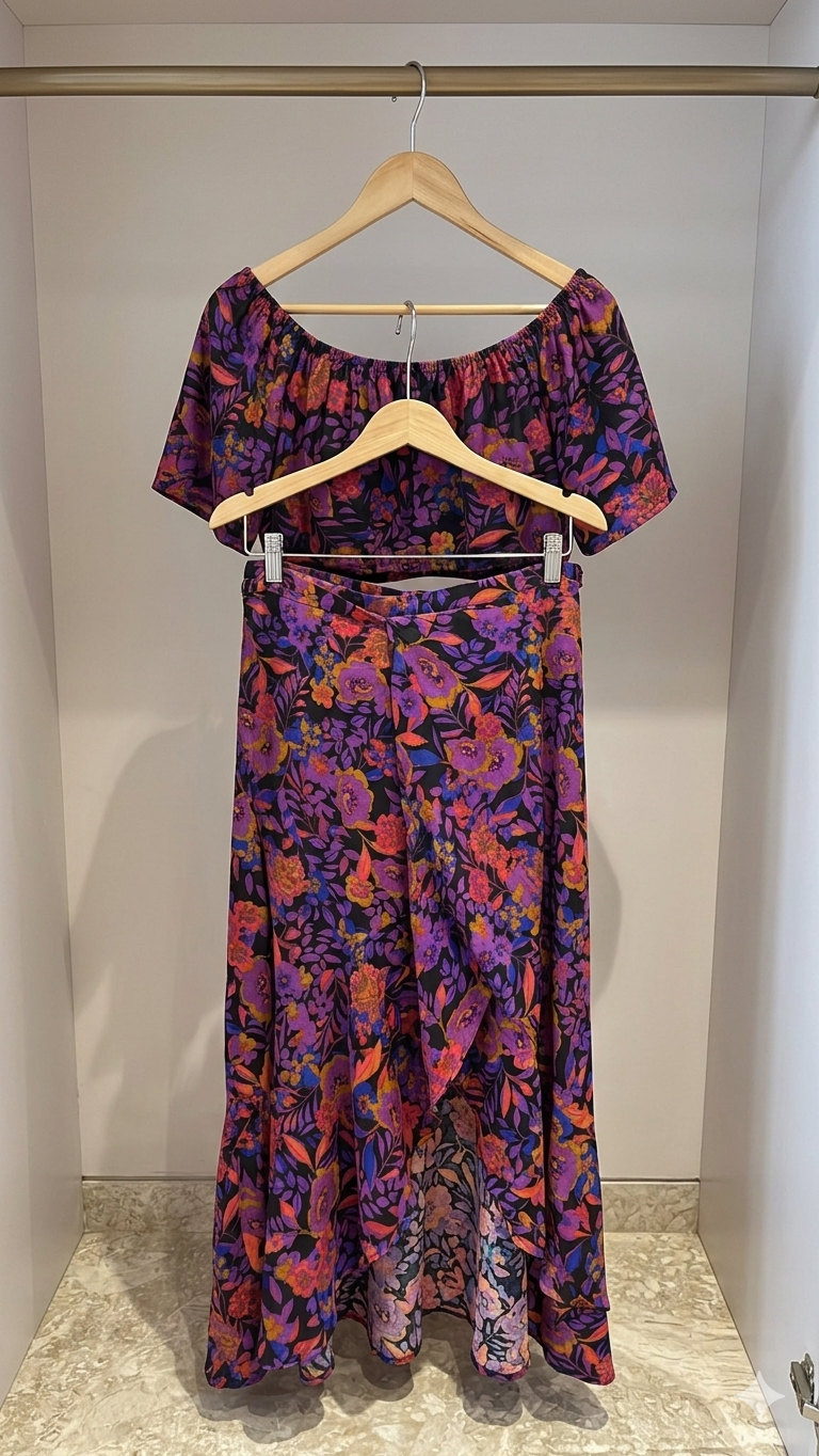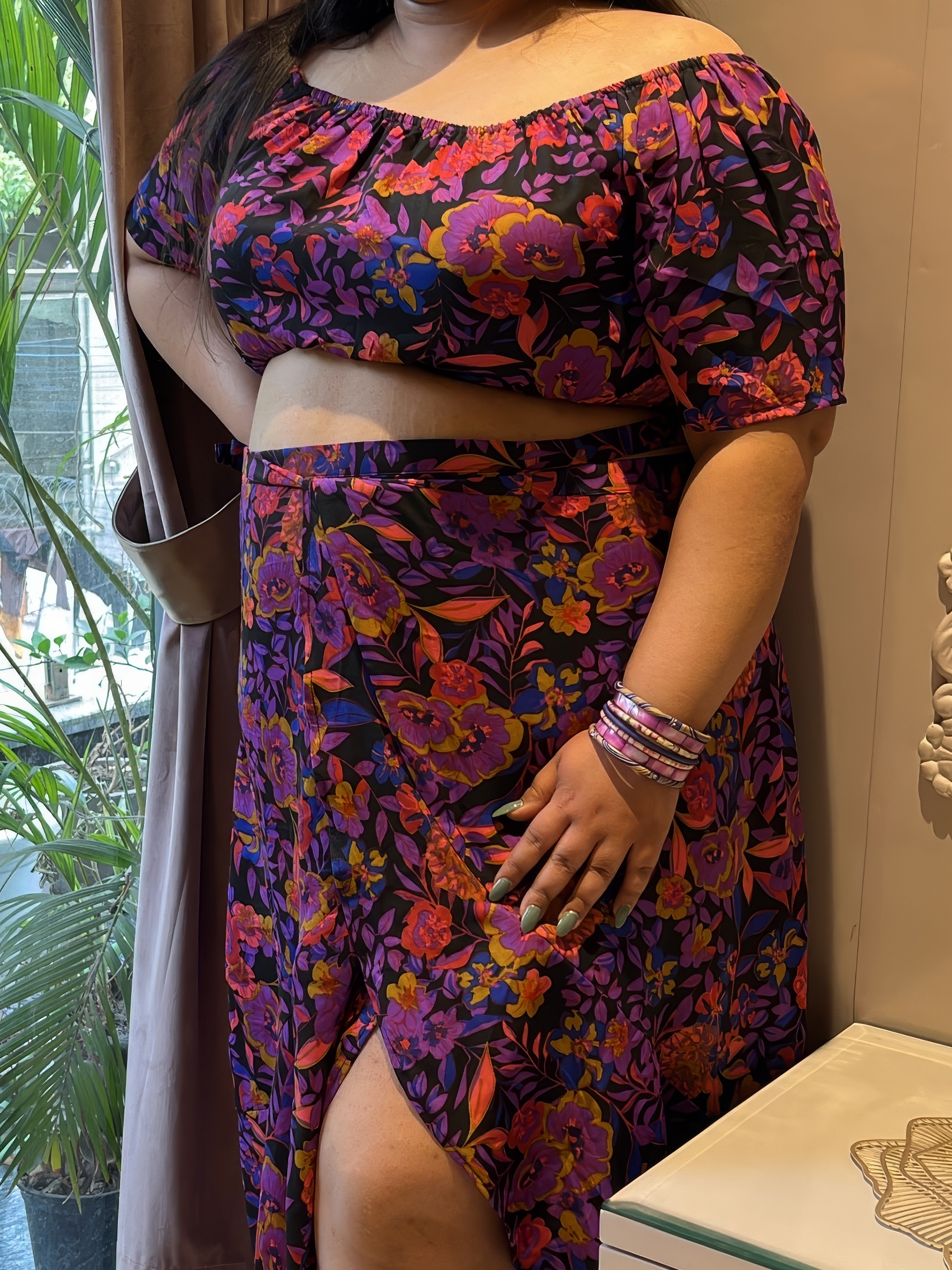 Featuring an off-shoulder crop top paired with a flowy high-slit skirt, this set is all about making a statement. The rich floral print adds a playful yet elegant touch, while the silhouette highlights your waist and gives you that effortless, head-turning look.